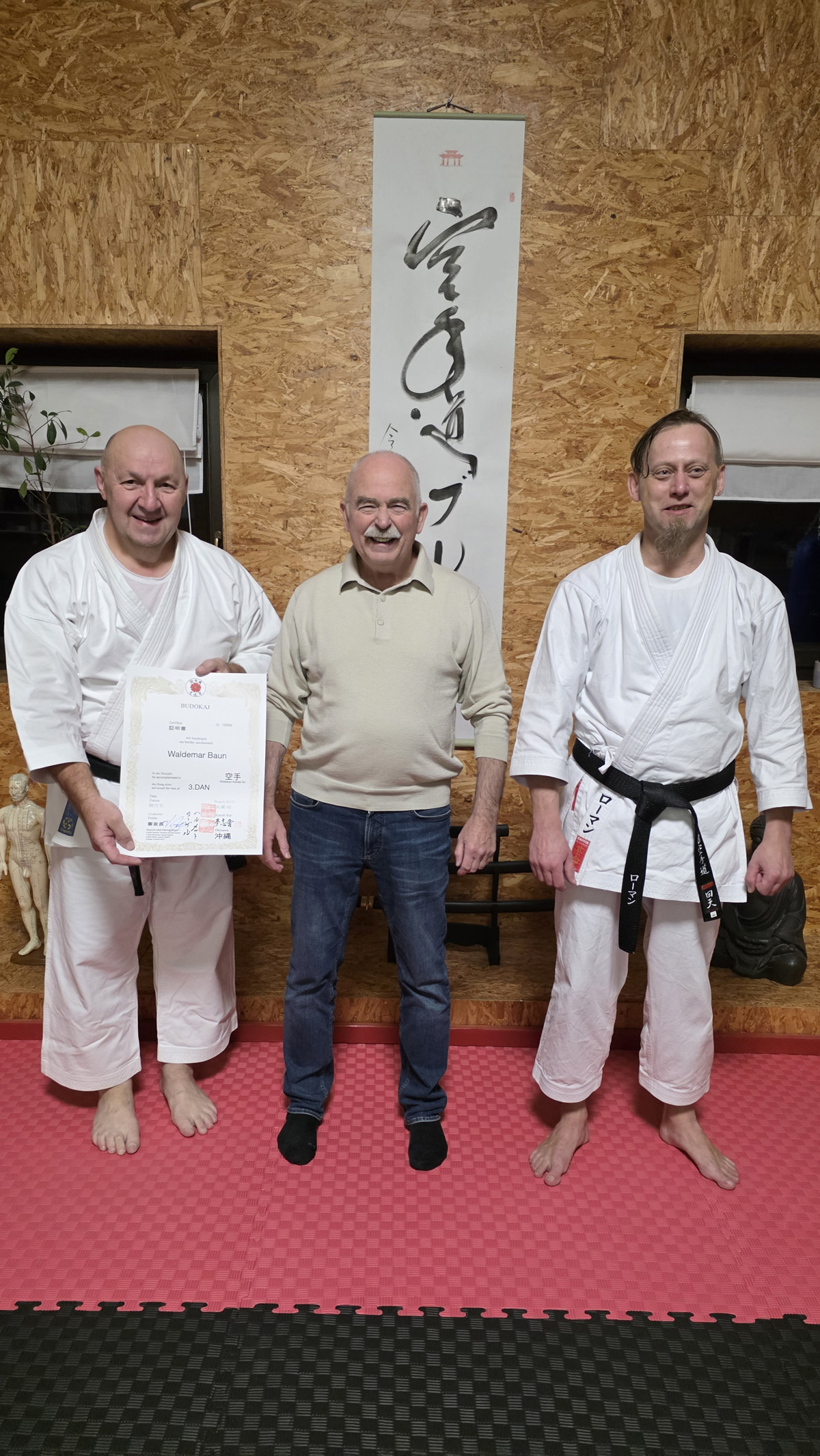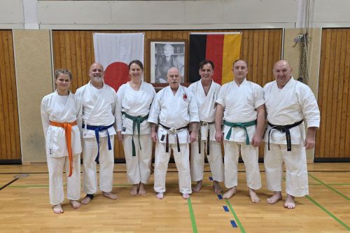 Eine schöne Besonderheit gab es auch. Am Abend zuvor hatte der Hambührener Trainer Waldemar Baun einen eigenen kleinen Lehrgang bei Shihan Kogel. Im Verlauf dieses Lehrgangs absolvierte er mit einer ausgezeichneten Leistung seine Prüfung zum 3. DAN. Unterstützt wurde er dabei von seinem Schüler, Sensei Roman Rheinsberg, der ihm beim Kumite (Kampf) und Bunkai (Techniken in der Anwendung) gegenübertrat.