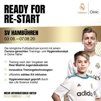 Vom 3. bis zum 7. August hat der SV Hambühren königlichen Besuch. Die Fundación Real Madrid Clinic (FRMC), die Fußballschule der Königlichen, setzt gemeinsam mit dem Verein ein 5-Tages-Fußballcamp um. Die Teilnehmer können sich auf ein professionelles Trainingskonzept basierend auf der Philosophie der Real Madrid Jugendakademie sowie auf innovative Trainingsmethoden und -technologien freuen.