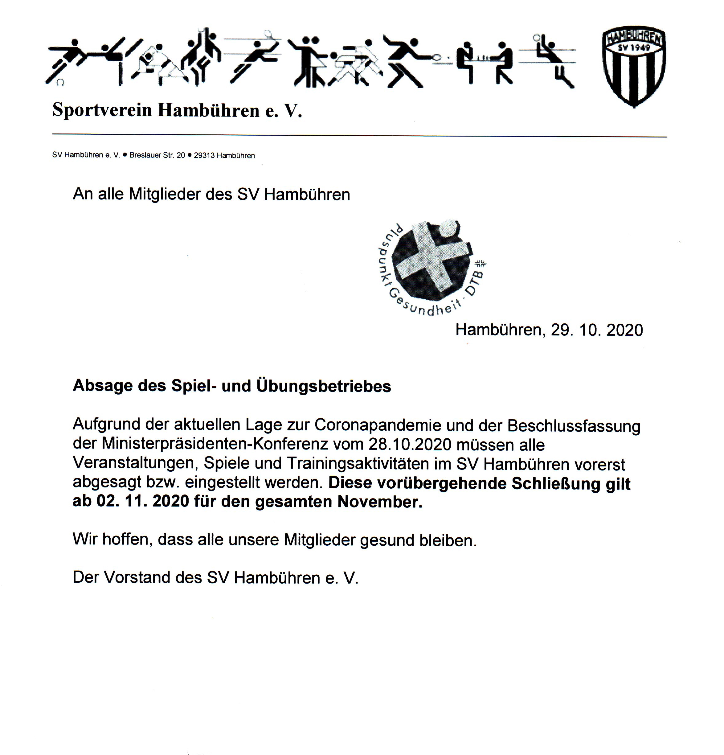 Ab Montag, 2. November beginnt nach längerer Pause wieder das Kinderturnen beim SV Hambühren unter Beachtung der derzeitigen Hygienevorschriften (u.a. Gerätedesinfektion, Listenführung, Abstand halten). Treffpunkt ist die Manfred Holz Grundschule, Hehlenbruchweg 37 in Hambühren.